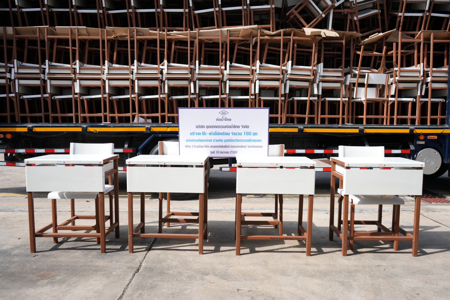 พลอากาศเอก ประจิน จั่นตอง ในฐานะประธานมูลนิธินวัตกรรมเพื่อชุมชน รับมอบ โต๊ะ เก้าอี้นักเรียน จำนวน 180 ชุด จากบริษัท อุตสาหกรรมท่อน้ำไทย จำกัด เพื่อส่งมอบให้กับ 3 โรงเรียน ที่ประสบอุทกภัยในพื้นที่อำเภอหาดใหญ่ จังหวัดสงขลา พร้อมทั้งส่งมอบสิ่งของเพื่อช่วยเหลือและฟื้นฟู