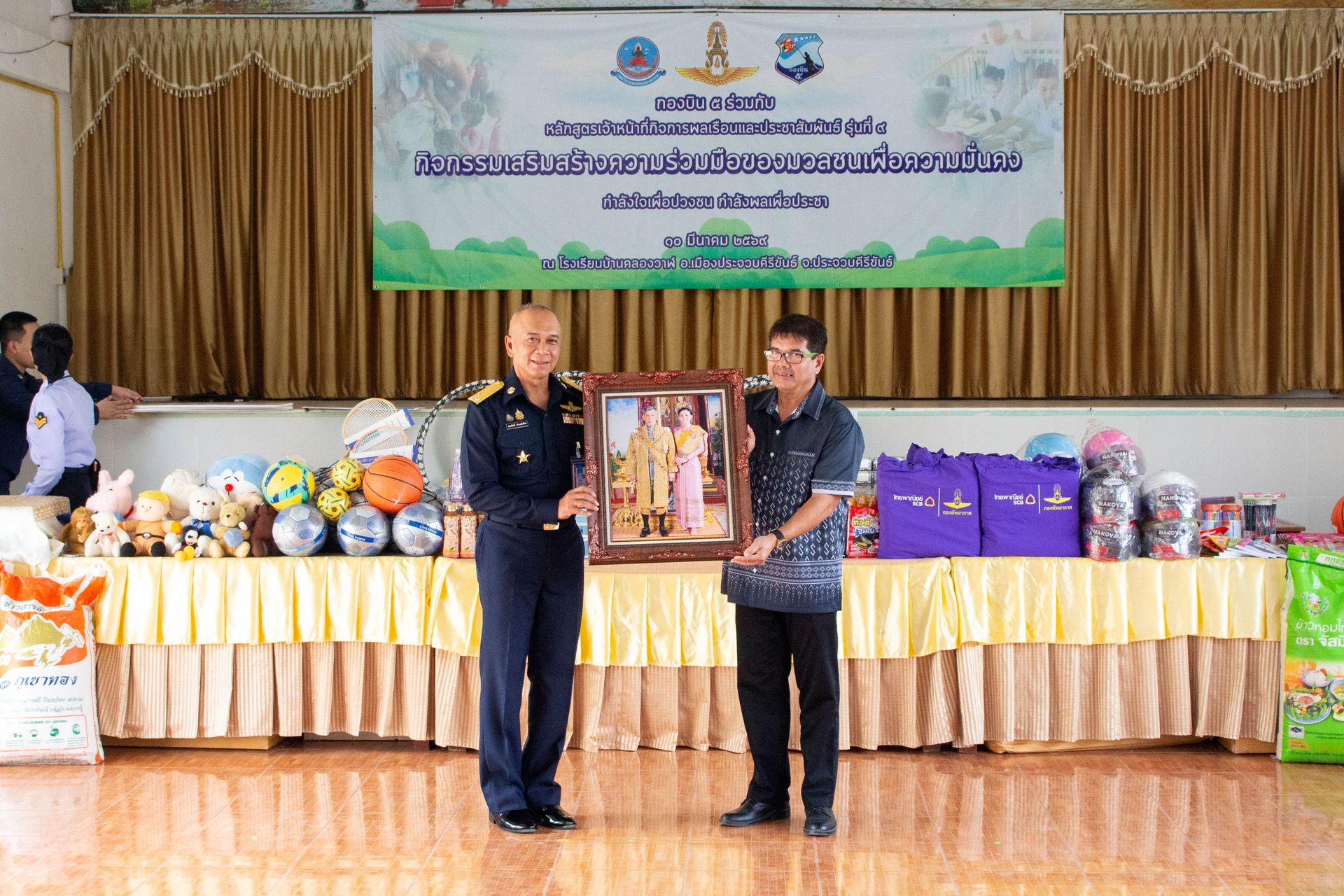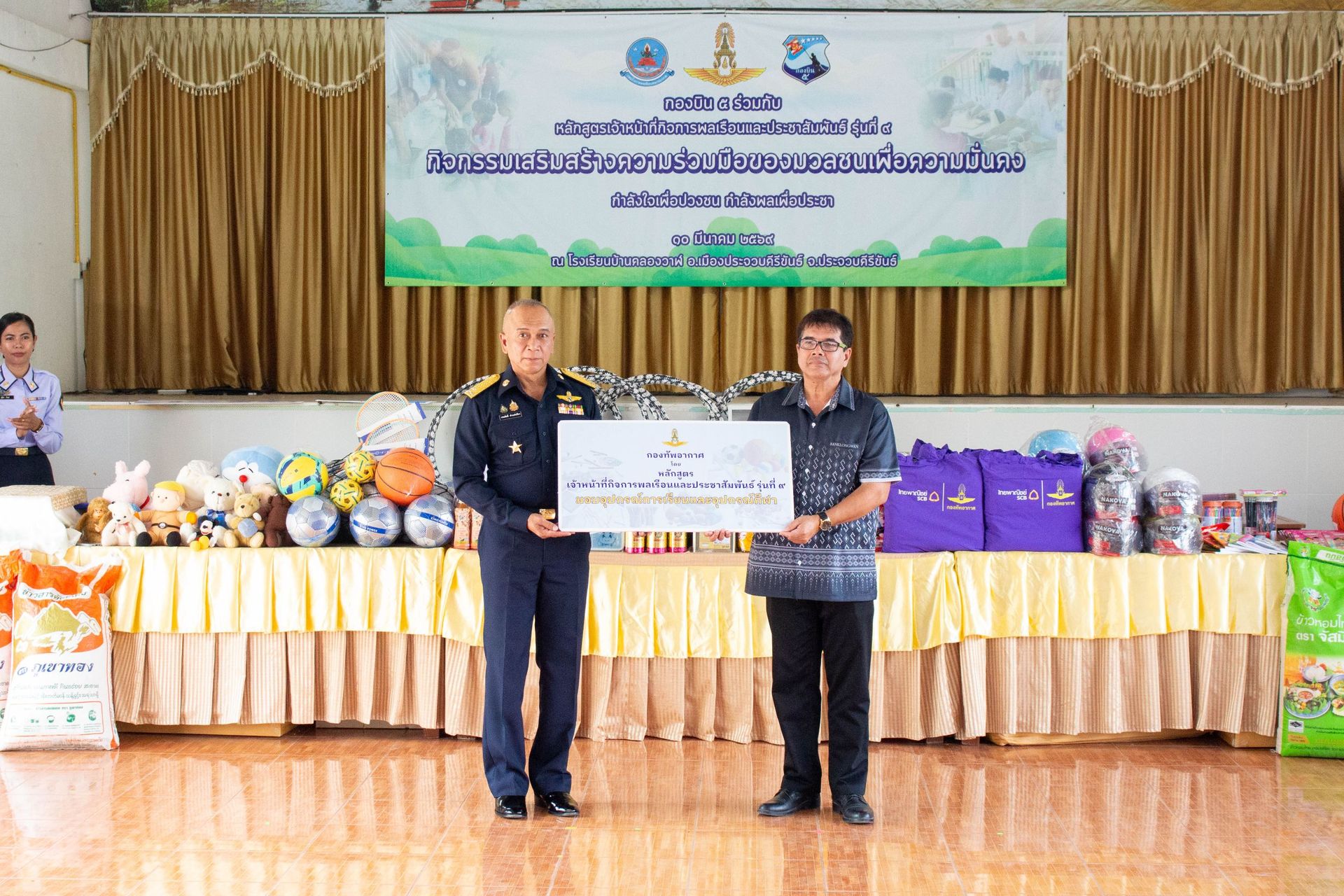 พลอากาศโท ประสิทธิ์ ดำรงค์ปรีชา เจ้ากรมกิจการพลเรือนทหารอากาศ เป็นประธานในการเปิดกิจกรรมหน่วยมิตรประชาช่วยเหลือประชาชน ร่วมกับ กองบิน 5 และ นทน.หลักสูตรเจ้าหน้าที่กิจการพลเรือนและประชาสัมพันธ์ รุ่นที่ 9 เมื่อวันที่ 10 มีนาคม 2569 ณ โรงเรียนบ้านคลองวาฬ ต.คลองวาฬ อ.เมืองประจวบคีรีขันธ์ จว.ประจวบคีรีขันธ์ โดยมี นาวาอากาศเอกเทพพิรักษ์ ฮ่อธิวงศ์ ผู้อำนวยการกองนโยบายและแผนสำนักนโยบายและแผน กรมกิจการพลเรือนทหารอากาศ ให้การต้อนรับ