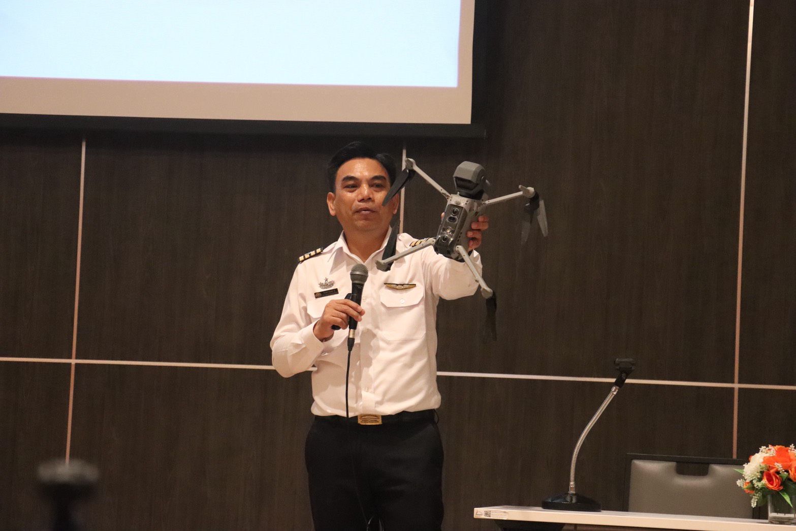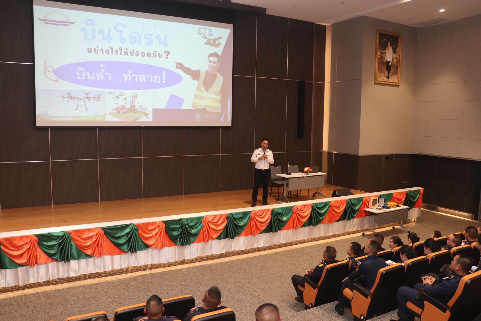 - 0925 รับฟังการบรรยาย เรื่อง ความปลอดภัยในการใช้อากาศยานซึ่งไม่มีนักบิน โดย จ่าอากาศโท ชาติชาย เจริญสุข ครูวิชาภาคพื้น กองวิชาบริการการจราจรทางอากาศ สถาบันการบินพลเรือน
