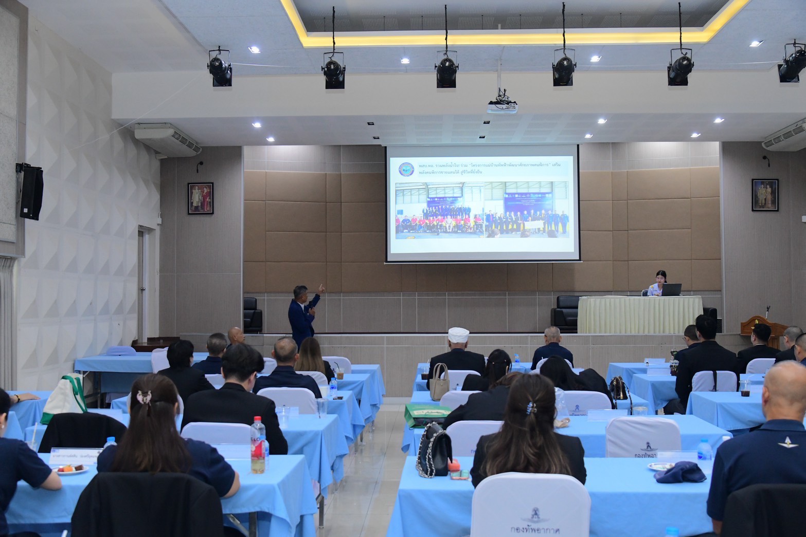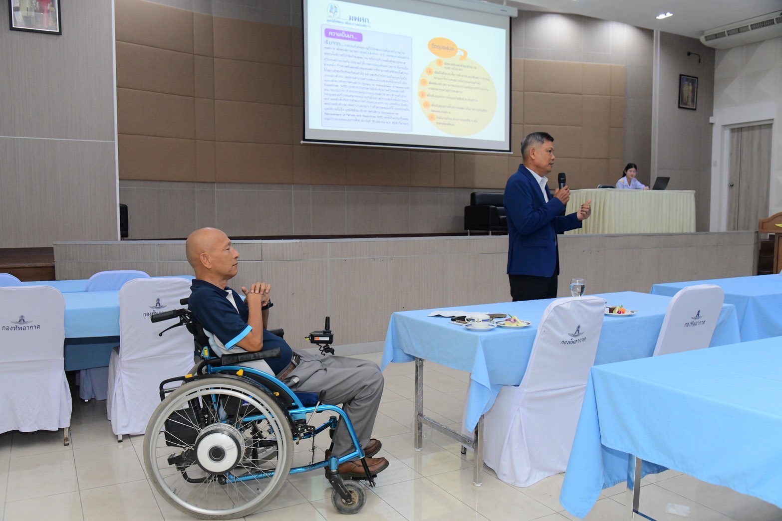 พลอากาศโท ประสิทธิ์ ดำรงค์ปรีชา เจ้ากรมกิจการพลเรือนทหารอากาศ พร้อมด้วย ผู้เข้ารับการฝึกอบรมโครงการฝึกอบรมหลักสูตรพัฒนาสัมพันธ์ระดับผู้บริหาร กองทัพอากาศ (พสบ.ทอ.) รุ่นที่ 20 ให้การต้อนรับ พลอากาศเอก วรกฤต มุขศรี และ พลอากาศตรี ภราดร คุ้มทรัพย์ ประธานมูลนิธิพัฒนาศักยภาพคนพิการ ให้เกียรติมาให้ข้อมูลเกี่ยวกับกิจกรรมพัฒนาศักยภาพคนพิการจังหวัดชายแดนใต้ ณ ห้องประชุมกองบิน 6 (อาคารหอประชุมธูปะเตมีย์)