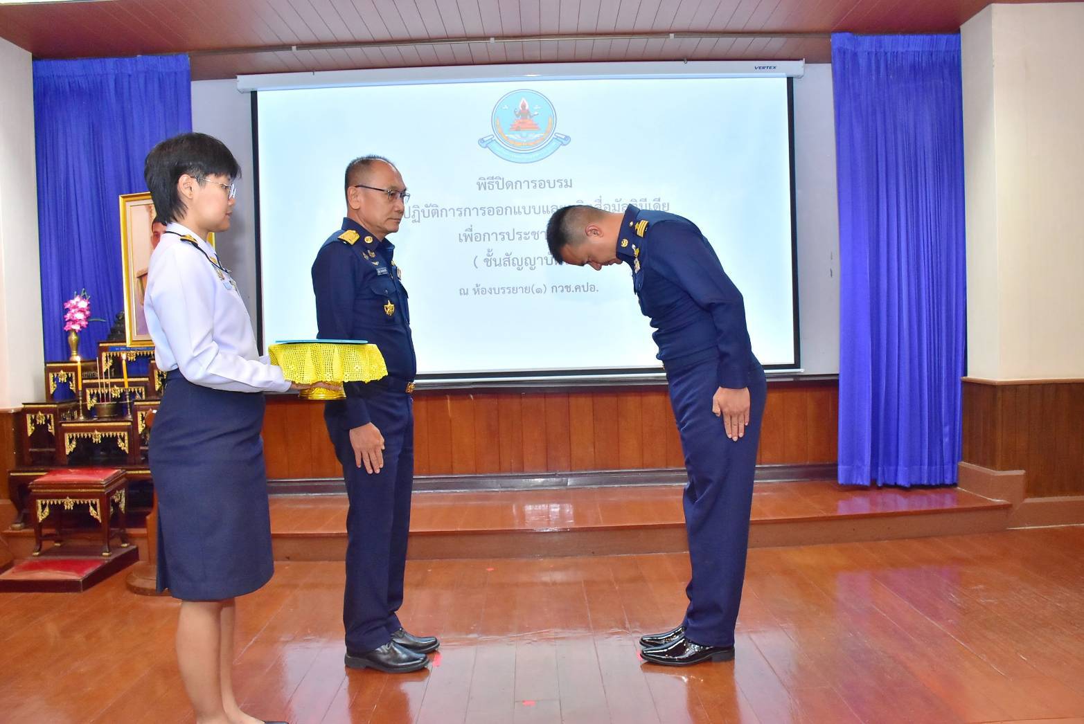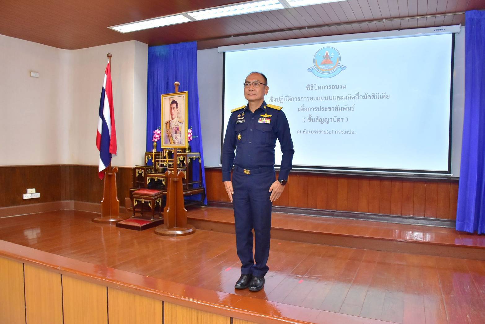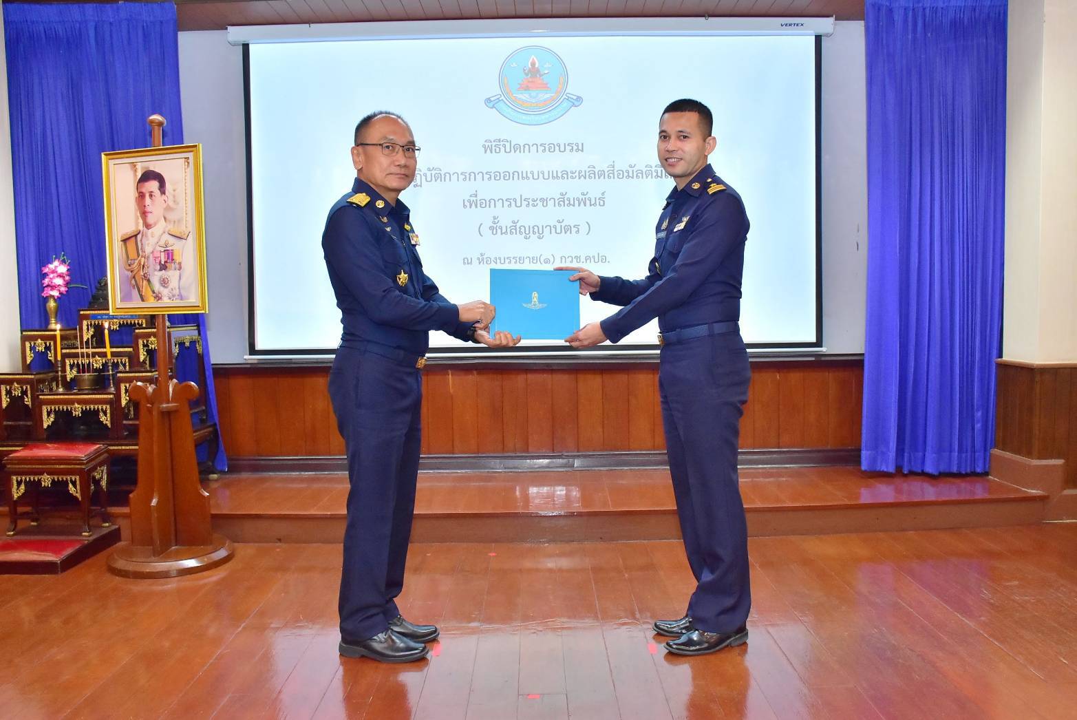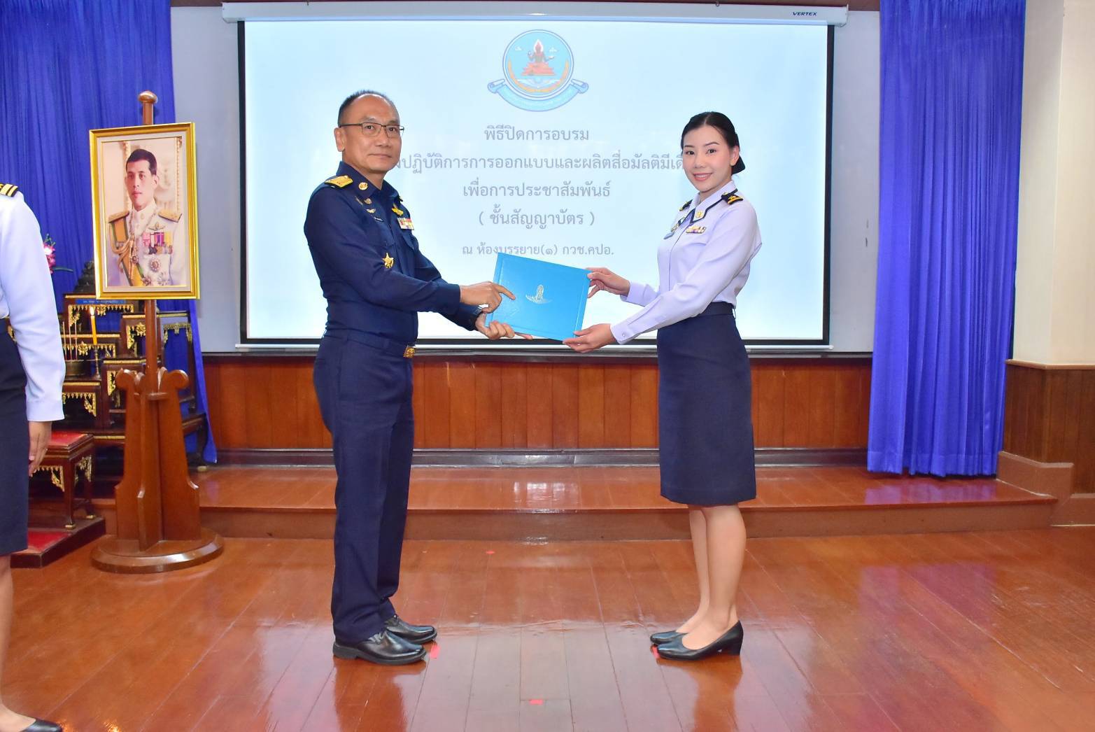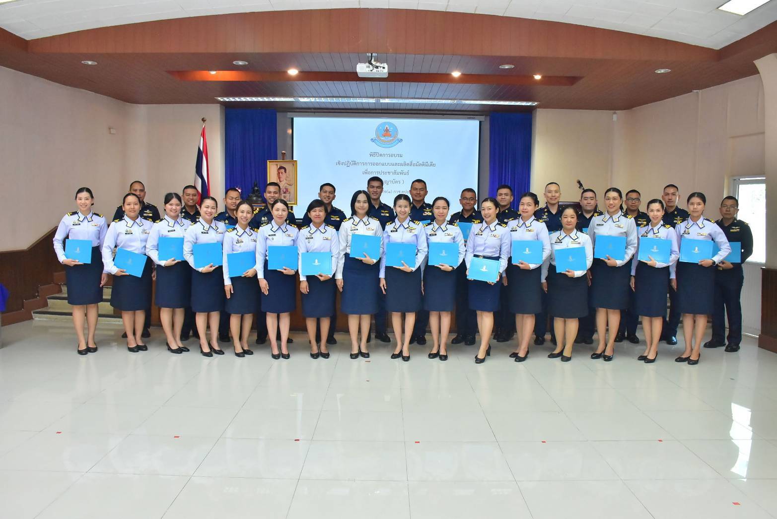 พลอากาศตรี สุวัฒน์ จตุรงค์พลาธิปัต ผู้อำนวยการสำนักกิจการพลเรือนและประชาสัมพันธ์ กรมกิจการพลเรือนทหารอากาศ เป็นประธานในพิธีปิดการอบรมเชิงปฏิบัติการ การออกแบบและผลิตสื่อมัลติมีเดียเพื่อการประชาสัมพันธ์ (ชั้นสัญญาบัตร) พร้อมมอบใบประกาศนียบัตร