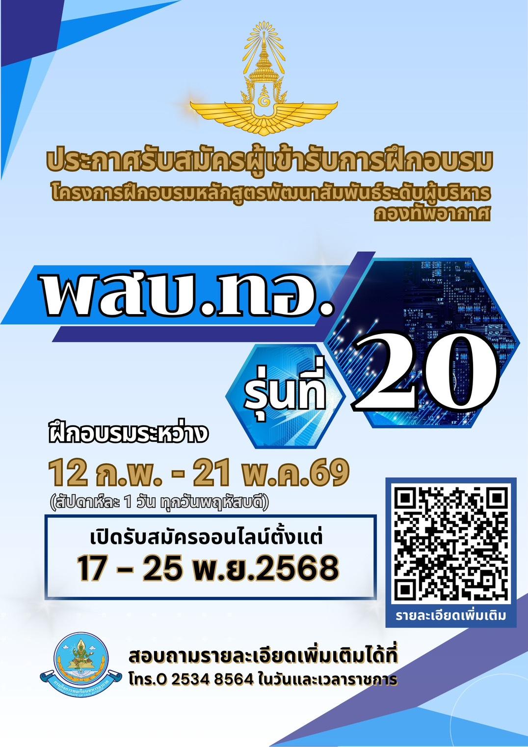 กรมกิจการพลเรือนทหารอากาศ เปิดรับสมัครบุคคลเข้ารับการฝึกอบรมหลักสูตร พัฒนาสัมพันธ์ระดับผู้บริหาร กองทัพอากาศ (พสบ.ทอ.) รุ่นที่ ๒๐